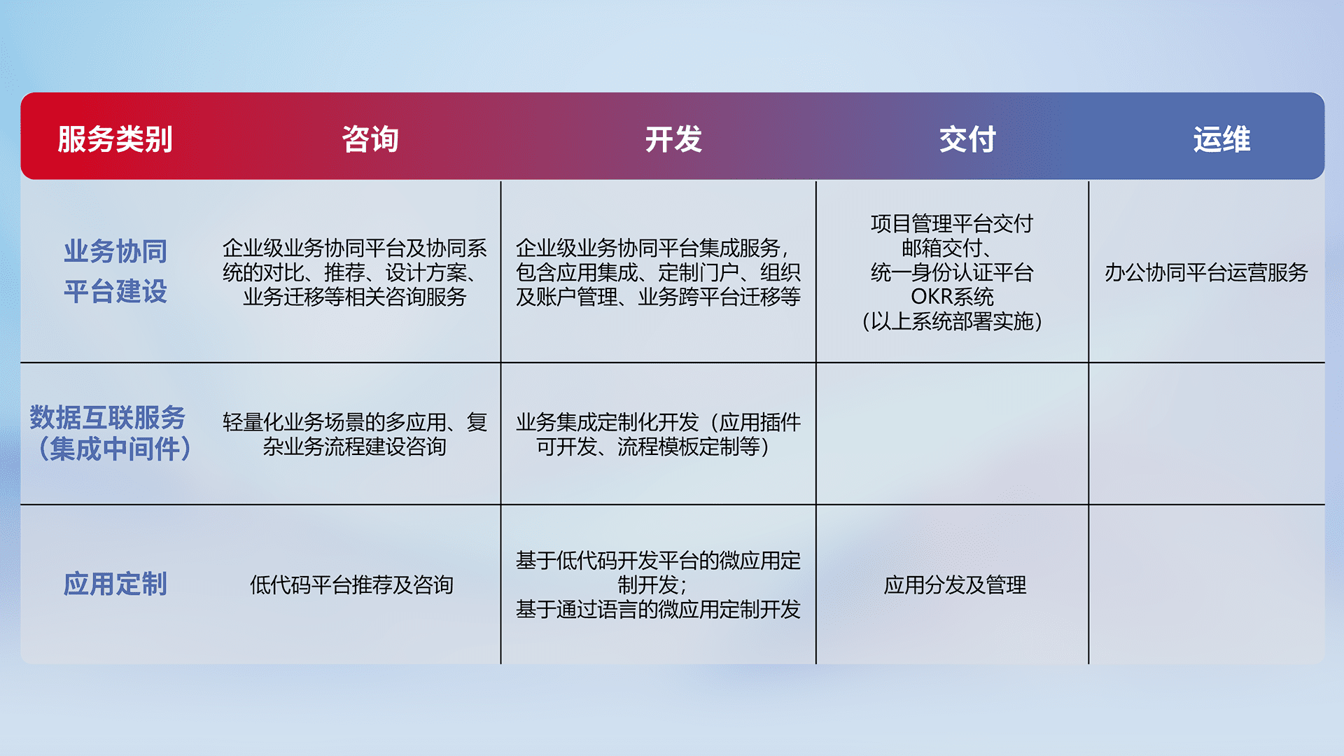 针对钉钉、、企微、、IDaas等平台级产品提供产品的规划、、、方案、、交付、、定制化开发等服务,,,实现如统一协同办公、、、、智能客户服务、、、、混合会议管理、、、、智能数据查询、、等业务场景,,,实现数字化转型。。