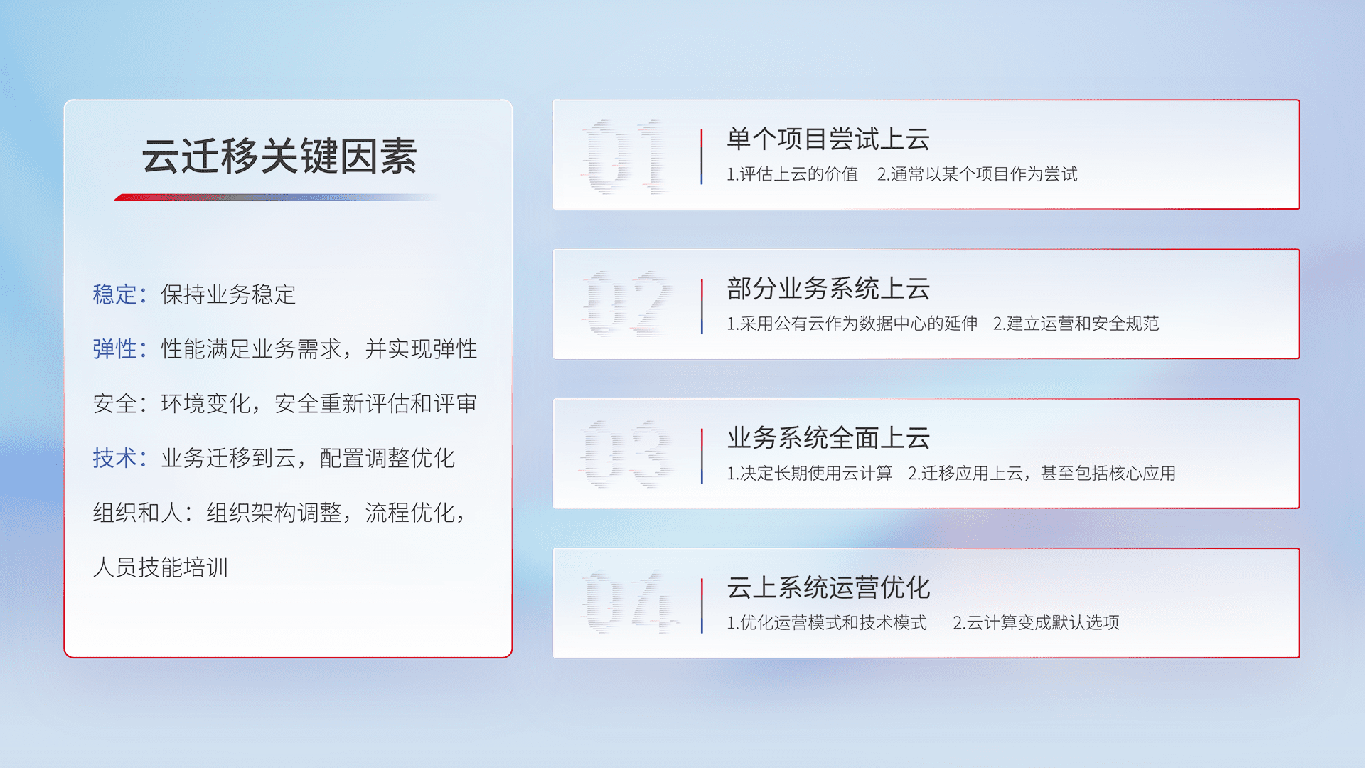结合实际业务,,,,从规划设计、、云平台选型、、、云原生改造、、、数据迁移、、、集成交付,,迁移全过程为客户识别最佳上云路径,,,做好风险识别管理,,,设计网络架构、、身份权限、、、、安全审计合规、、操作审计、、、、日志审计、、监控告警策略、、、、多站点容灾设计等,,,,对云上基础设施进行整体规划,,,提升IT治理水平,,,以满足弹性、、高可用、、高性能的需求。。
