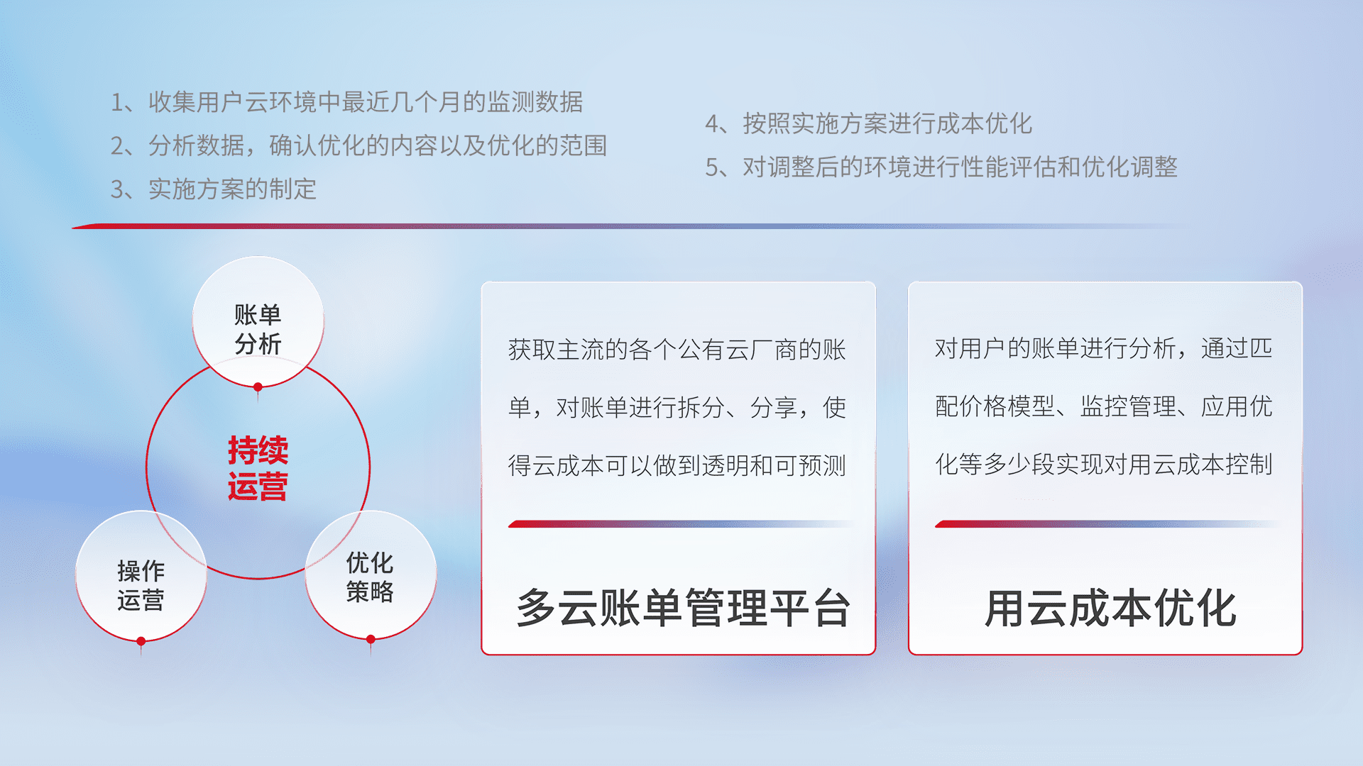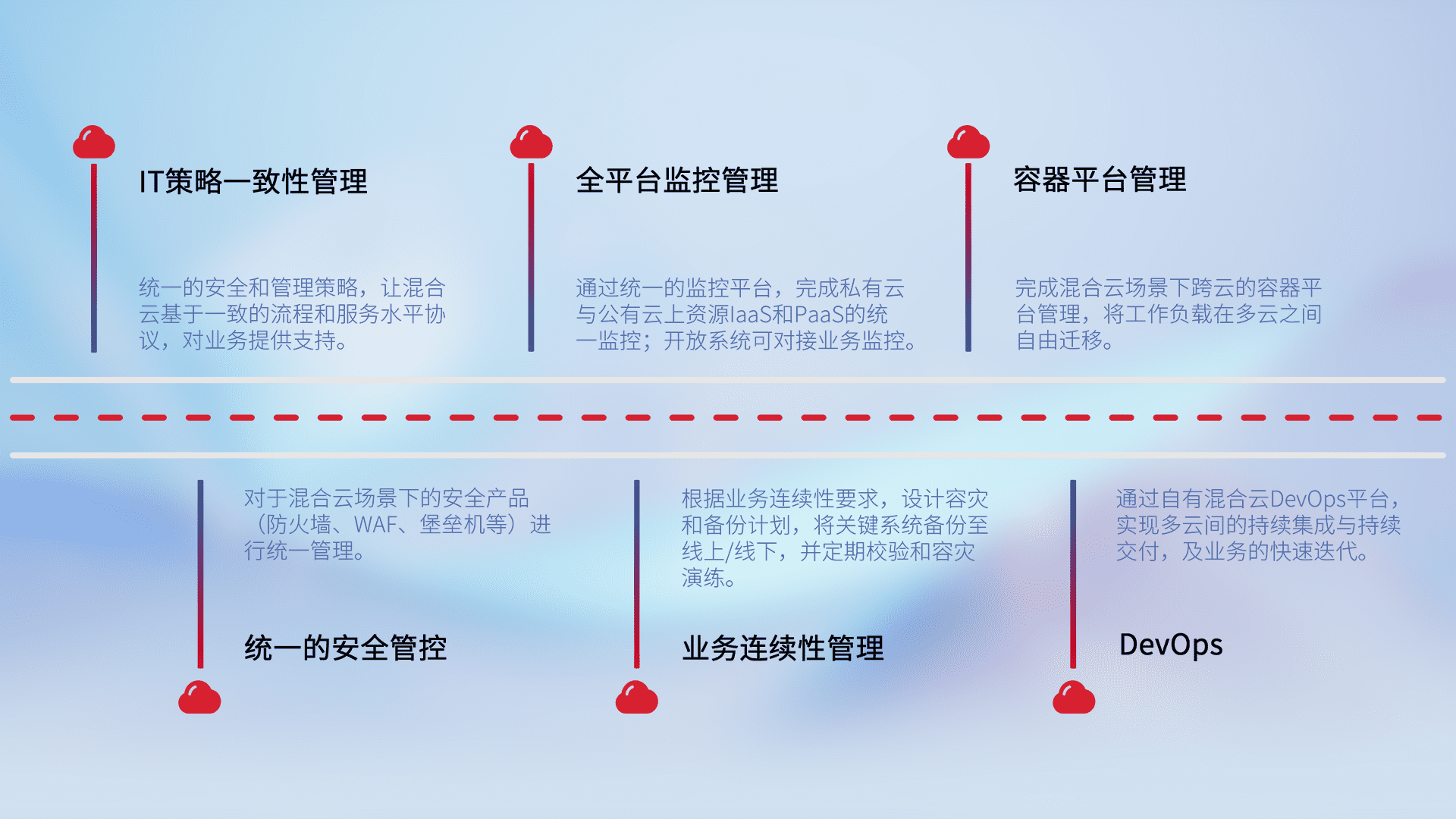 通过多云纳管,,以统一的资源数据模型把客户的云资源进行抽象和封装,,,进而实现对多云资源的统一操作,,,,保障云资源管理的可靠性、、、稳定性与可用性。。。量身定制化运维内容,,,配置、、、、开发运维、、、补丁管理、、备份、、监控、、、认证和访问管理、、、、审计和日常巡检等,,保障在用云过程中的可靠度,,,,稳定度以及高可用率。。。